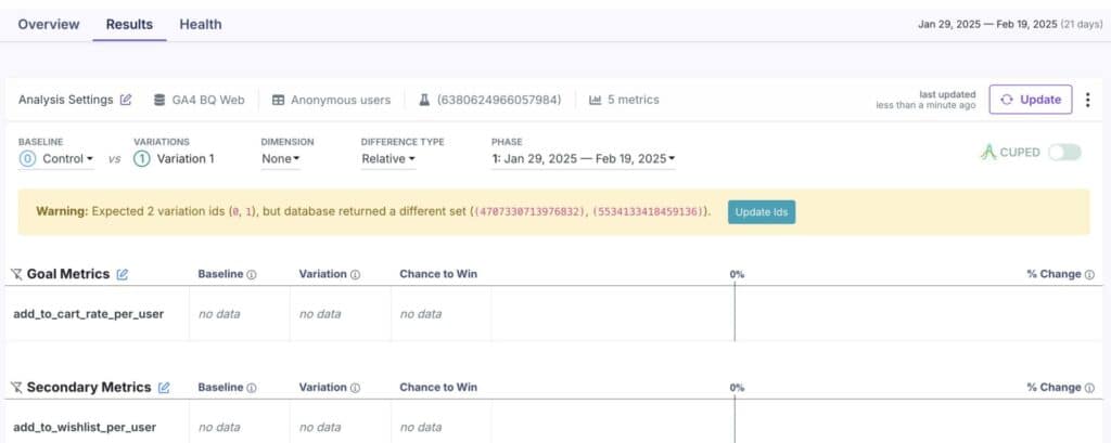 Once you’ve started your experiment you’ll see two new tabs in your experiment, results and health. To get the data from BigQuery, simply click the update button.
